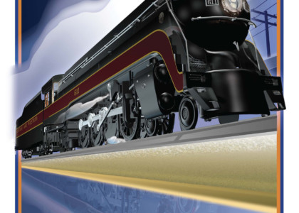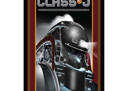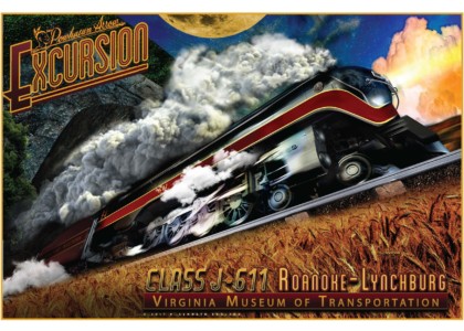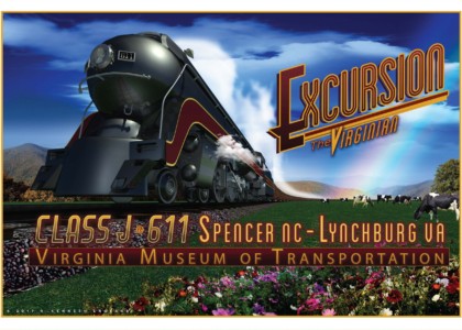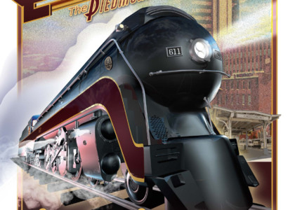 The 611 gathers all the iconic elements of the Art Deco era of train travel. The sleek, streamlined profile took the edge off the gritty industrial jacket that transportation by rail proffered. The Class J passenger locomotives were designed and built by Norfolk and Western Railway between 1941 and 1950. With very sleek lines and a bullet shaped profile adorned with a Tuscan Red stripe bordered in gold, cut a fast black shape against the rural landscapes as well as the urban areas it would serve. The J’s were built in the shops of the N & W and powered famous routes with names such as the Powhatan Arrow, Cavalier, and Pocahontas to name a few. The J’s embodied the innovation and ingenuity of engineering as it symbolized the pinnacle of steam technology.